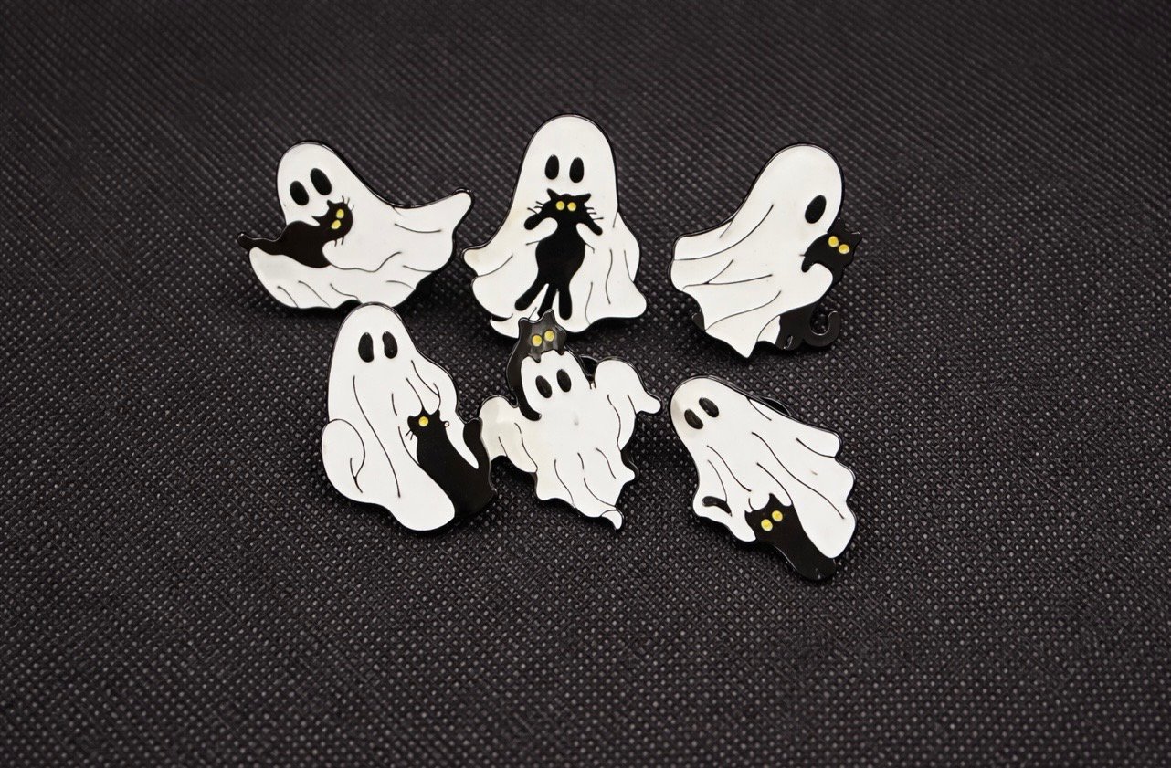 Add a little spooky charm to your collection with this adorable set of ghost pins featuring mischievous black cats peeking through flowing sheets. Perfect for Halloween lovers, cat enthusiasts, and anyone who enjoys a touch of spooky-cute style.