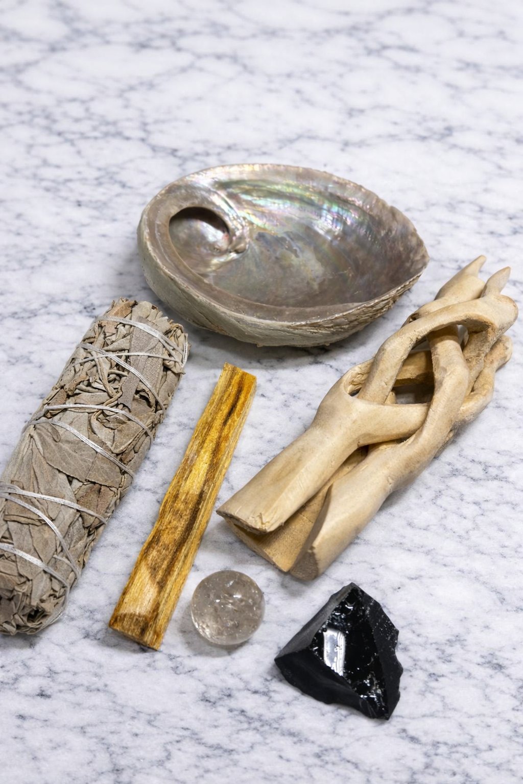 You get 1 abalone shell, 1 sage bundle, 1 paleo santo, 1 raw obsidian, 1 clear quartz, and a stand.