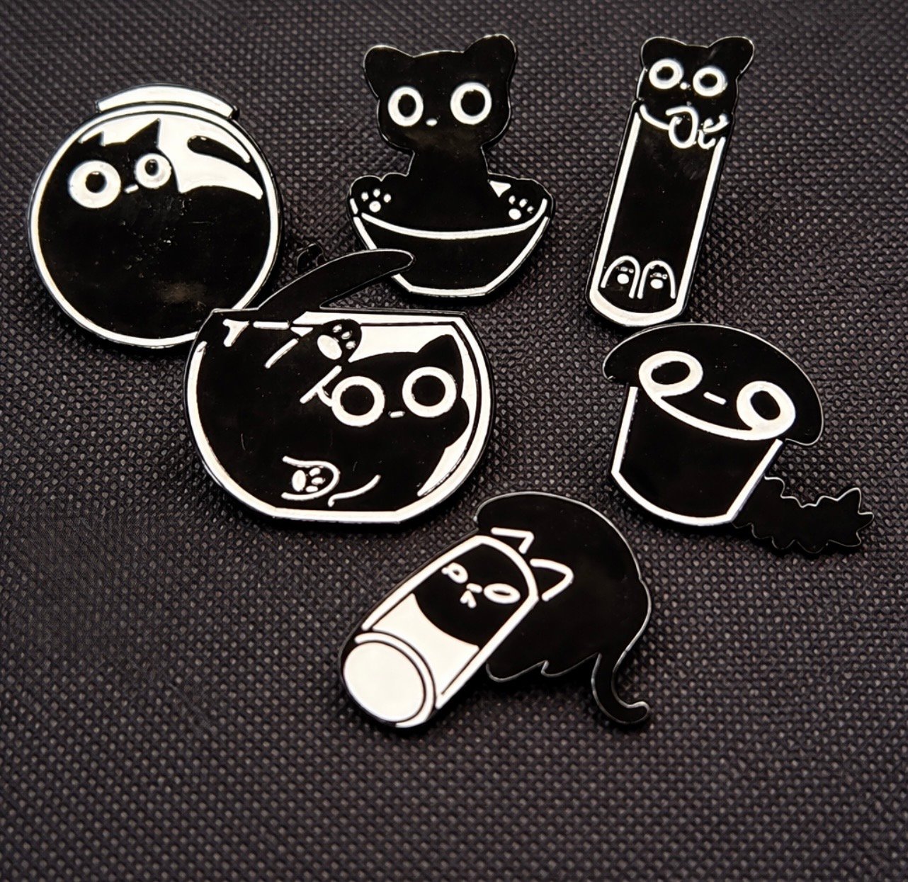 These adorable pins capture the curious and mischievous nature of cats as they peek out of cups, jars, and all sorts of unexpected places. Perfect for cat lovers who know that if there’s a container nearby, a kitty will find a way inside.