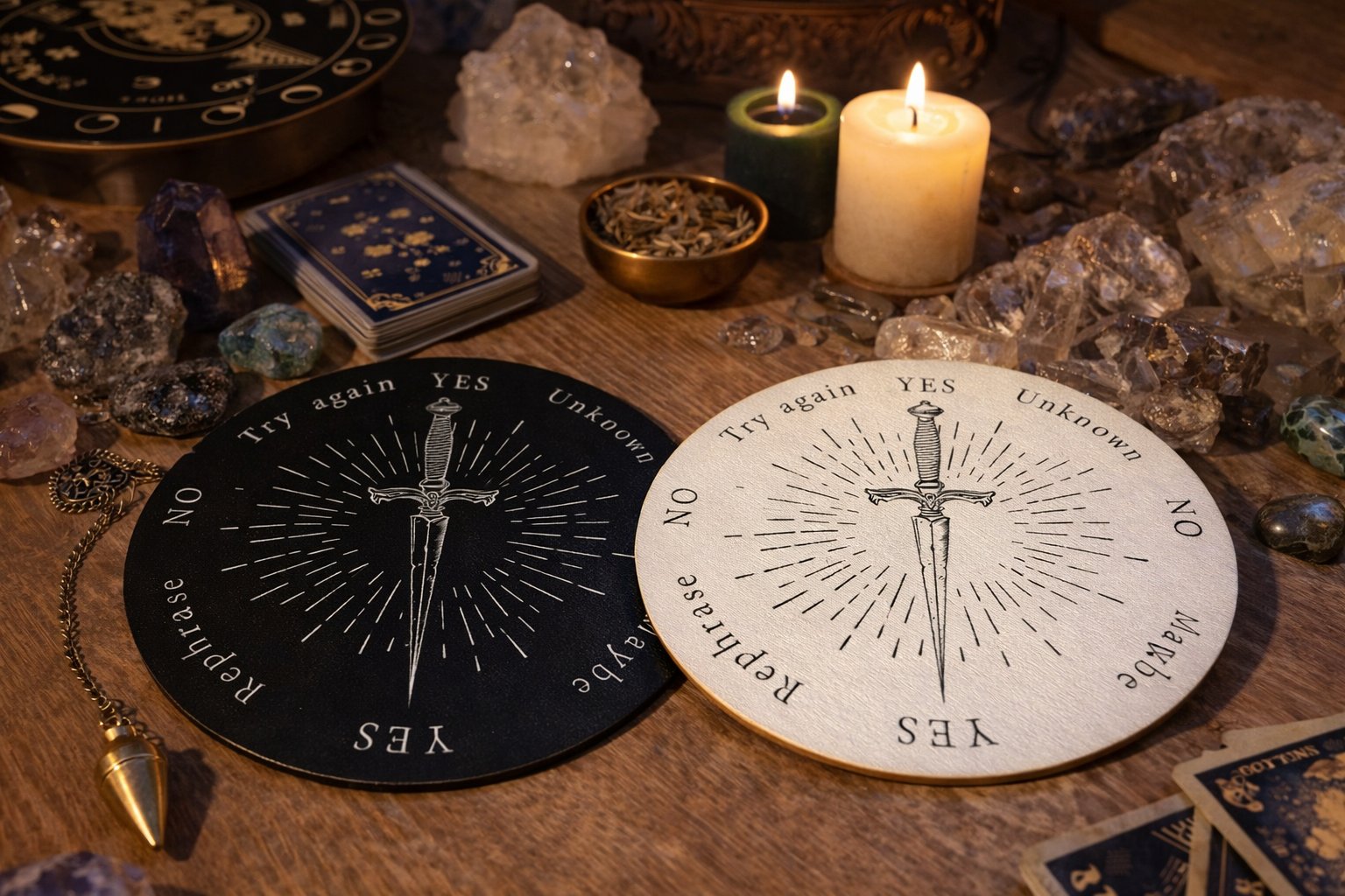 With every pendulum board purchase, you will receive a randomly selected handmade pendulum—intuitively chosen just for you. Each pendulum is unique, adding a personal and magical touch to your divination practice.