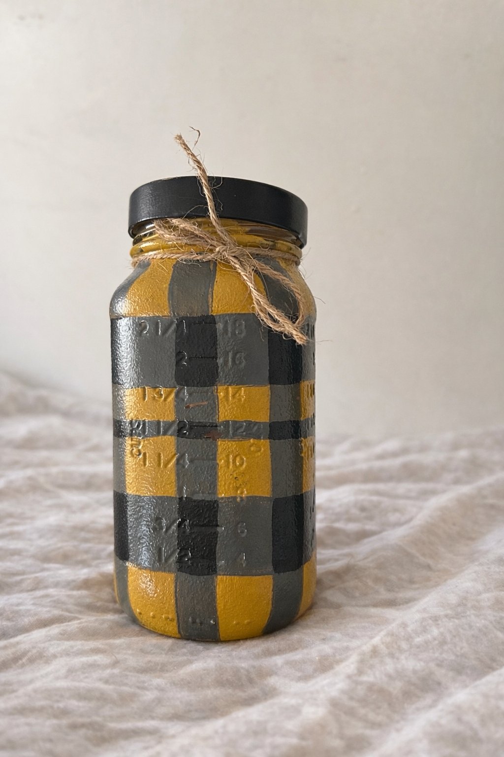 This one-of-a-kind stash jar began its journey as a humble spaghetti jar and has been transformed into a cozy, cottagecore treasure. Handpainted in a warm golden mustard and deep charcoal plaid, it carries rustic charm with a touch of forestcore energy—perfect for those who love earthy aesthetics and intentional living.