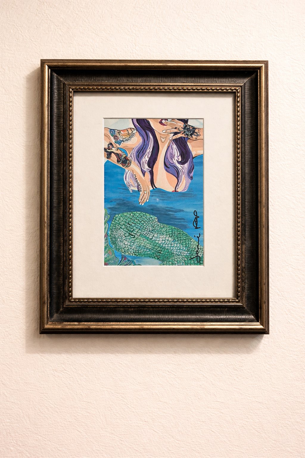 Bring a splash of bold, ocean-inspired beauty into your space with this stunning framed mermaid art print. Featuring a tattooed siren rising from deep blue waters, this piece blends edgy artistry with soft, dreamy tones—perfect for adding a unique statement to your gallery wall, altar space, or cozy nook.