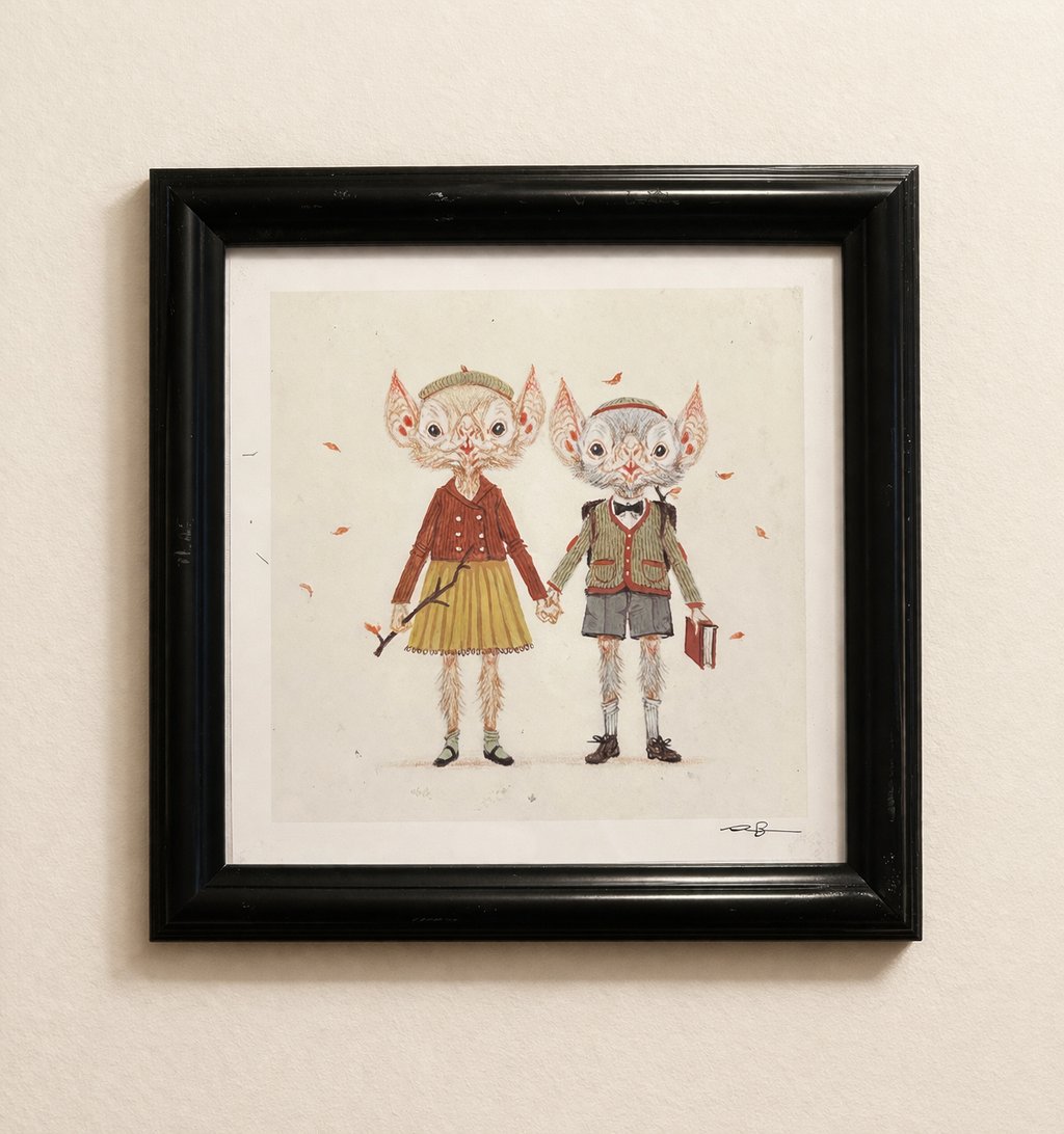 This charming and slightly eerie art print features two whimsical woodland characters, hand-in-hand, dressed in vintage-inspired attire. With delicate details, soft earthy tones, and a storybook-meets-oddity aesthetic, this piece brings a unique blend of cozy and curious energy to any space.